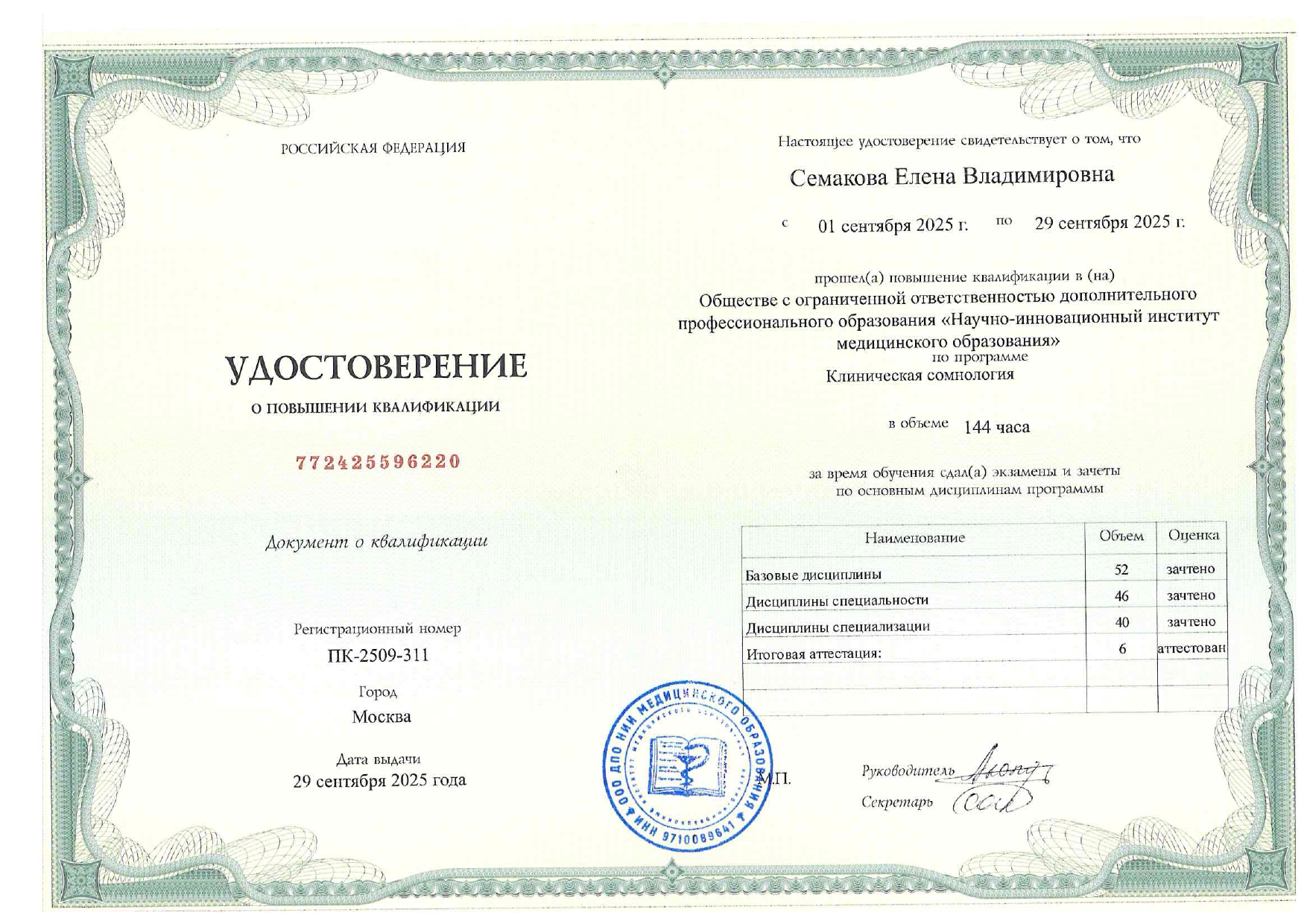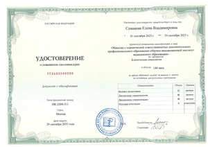 - 2025, Москва, ООО ДПО «Научно-инновационный институт медицинского образования», «Клиническая сомнология».