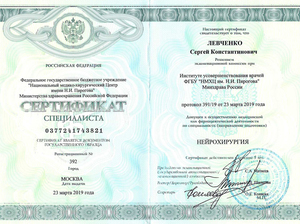 - 2019, Москва, ФГБУ НМЦХ им Н.И Пирогова, специальность «Нейрохирургия»;