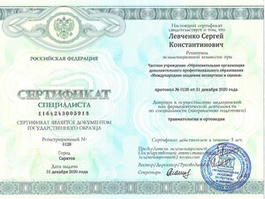 - 2020, Саратов, Международная академия экспертизы и оценки, специальность «Травмотология и ортопедия»;
