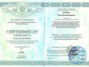 - 2007, Чебоксары, ГОУ Институт усовершенствование врачей МЗСР ЧР, интернатура по специальности «Терапия».