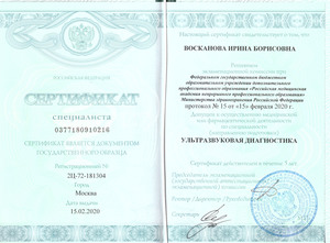 - 2020, Москва, Российская медицинская академия непрерывного профессионального образования, специальность «Ультразвуковая диагностика».