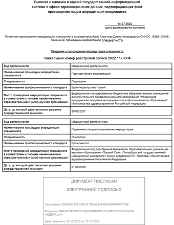 - Санкт-Петербург, Федеральное государственное бюджетное образовательное учреждение высшего образования «Северо-Западный государственный медицинский университет имени И.И. Мечникова» Министерства здравоохранения Российской Федерации, педиатрия (повышение квалификации);