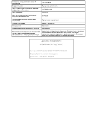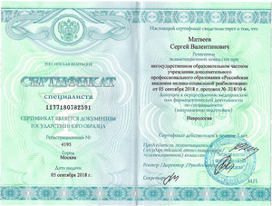 - 2013, Санкт-Петербург, Северо-Западный государственный медицинский университет им. И.И. Мечникова, интернатура по специальности «Неврология».