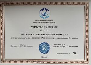 - 2023, Член Медицинской ассоциации профессиональных остеопатов.
