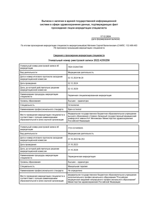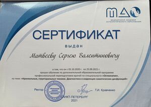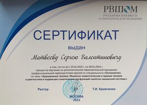 - 2014, Санкт-Петербург, Северо-Западный государственный медицинский университет им. И.И. Мечникова, специальность «Мануальная терапия»;