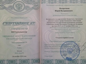 - 2020, Москва, Центральная государственная медицинская академия, «Оториноларингология»;