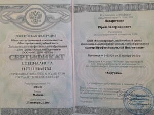 - 2020, Москва, Центр Профессиональной Подготовки, «Хирургия».