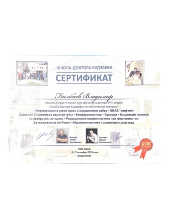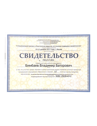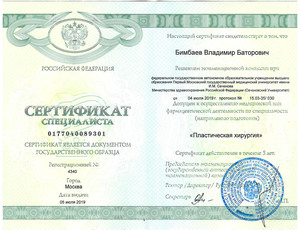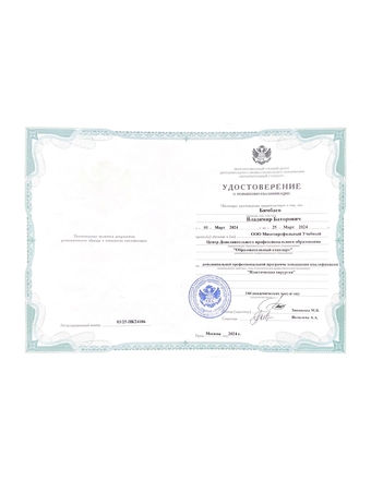 - 2024, Федеральное государственное бюджетное образовательное учреждение дополнительного профессионального образования "Российская медицинская академия непрерывного профессионального образования" Министерства здравоохранения Российской Федерации, специальность "Врачпластический хирург".