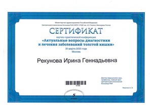 - 2021, Участие в научно-практической конференции, «Актуальные вопросы диагностики и лечения заболеваний толстой кишки».