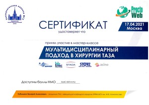 - 2020, Москва, ФГБУ «ГНЦ Лазерной медицины им.О.К.Скобелкина ФМБА России», специальность «Лазерные технологии в колопроктологии»;