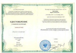 - 2018, Москва, Государственный научный центр Россиской Федерации Федеральный медцинский биофизический центр имени А.И. Бурназяна, по специальности «Колопроктология»;