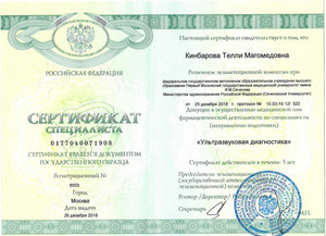 2013, Москва, ФГБОУ ДПО «Институт повышения квалификации ФМБА России», специальность «Ультразвуковая диагностика».