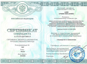 - 2020, Москва, ООО «Межрегиональный центр непрерывного медицинского и фармацевтического образования», специальность «Акушерство и гинекология»;