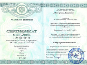 - 2020, Москва, ООО «Межрегиональный центр непрерывного медицинского и фармацевтического образования», специальность «Ультразвуковая диагностика.