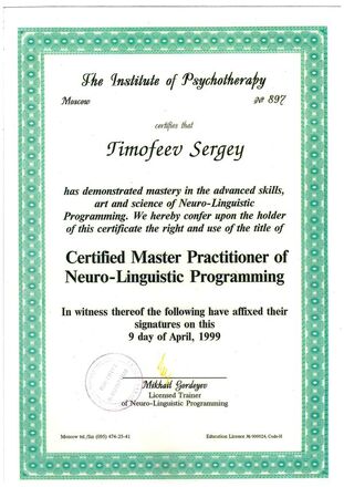 - 1999, Москва, Институт психотерапии и клинической психологии, Master-practitioner of NLP;