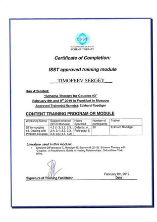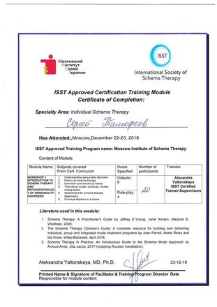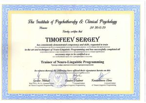 - 2015, Москва, Институт психотерапии и клинической психологии, Trainer of NLP;