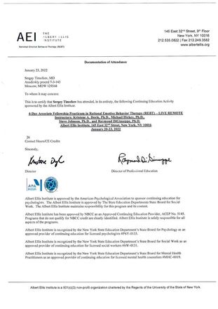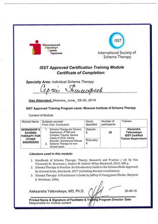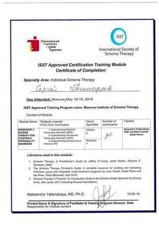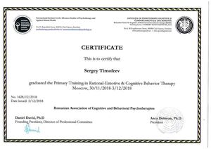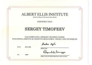 - 2019, Нью-Йорк, Albert Ellis Institute, базовый курс: «Рационально-эмоционально-поведенческая терапия (REBT)»;