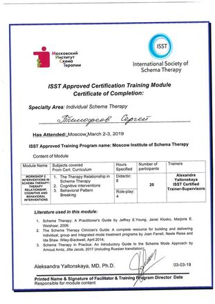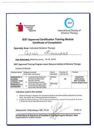 - 2015, Москва, курс «Когнитивно-поведенческая психотерапия»;