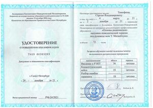 - 2006, Москва, Российская медицинская академия последипломного образования, специальность «Психотерапия».