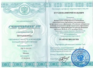 2018, Москва, Российская медицинская академия непрерывного профессионального образования МЗ РФ, специальность: «Трансфузиология».