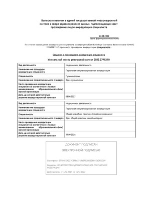 - 2022 , Москва, ООО «Институт дополнительного образования и повышения квалификации», курс «Актуальные вопросы торакальной онкологии».