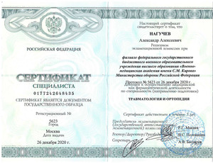 - 2016, Москва, ИУВ ФГБУ «НМХЦ им. Н.И. Пирогова» Минздрава России, ординатура по специальности «Травматология и ортопедия»;