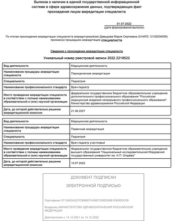 - 2022, Москва, ФГБОУ ДПО «Российская медицинская академия непрерывного профессионального образования» Министерства здравоохранения Российской Федерации, повышение квалификации по специальности «Современные вопросы педиатрии».