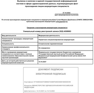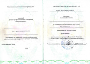 - 2021, Москва, Государственный научный центр Российской Федерации- Федеральный медицинский биофизический центр имени А.И. Бурназяна, специальность «Cтоматолог-терапевт».