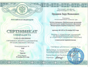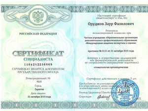- 2019, Москва, Образовательная организация дополнительного профессионального образования «Международная академия экспертизы и оценки», специальность «Стоматология ортопедическая».