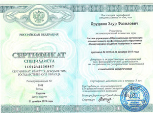 - 2019, Москва, Образовательная организация дополнительного профессионального образования «Международная академия экспертизы и оценки», специальность «Стоматология хирургическая»;