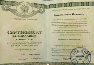 - 2016, Санкт-Петербург, Государственный медицинский университет им. академика И.П. Павлова, специальность «Врач-стоматолог хирург».