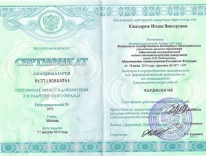 - 2014, Москва, Российская медицинская академия последипломного образования, ординатура по специальности «Кардиология».