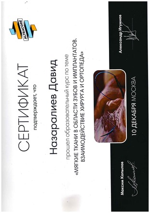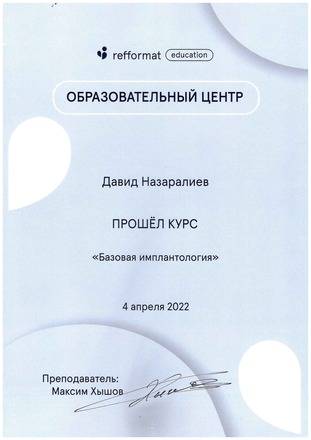 - 2022, Москва, ФМБА А.И. Бурназяна, специальность «Врач-стоматолог-хирург, имплантолог».