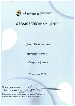 - 2021, Москва, Altracore education, «Синус-лифтинг»;