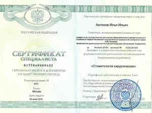 - 2019, Москва, Первый Московский государственный медицинский университет им. И.М. Сеченова, специальность «Врач стоматолог-хирург».