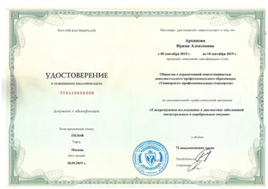 - 2019, Москва, Общество с ограниченной ответственностью дополнительного профессионального образования «Университет профессиональных стандартов». «Ультразвуковое исследование в диагностике заболеваний магистральных и церебральных сосудов».