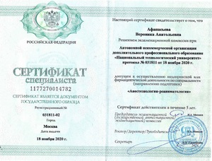 - 2017, Санкт-Петербург, федеральное государственное бюджетное образовательное учреждение высшего образования «Северо-Западный государственный медицинский университет имени И.И. Мечникова» МЗ РФ, «Анестезиология и реаниматология (с углубленным изучением новых технологий)»;