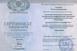- 2007, Санкт-Петербург, Медицинская академия последипломного образования, специальность «Онкология»;