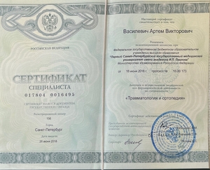 - 2018, Санкт-Петербург, Государственный медицинский университет им. Павлова, специализация «Травматология-ортопедия».