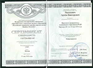 - 2020, Факультет непрерывного медицинского образования РУДН, Ординатура по специальности «Нейрохирургия».