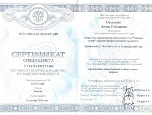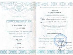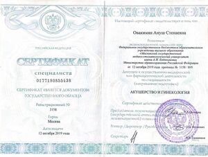 - 2008, Москва, Московская Медицинская Академия им.И.М. Сеченова, специальность «Врач акушер-гинеколог».