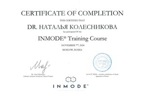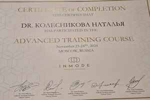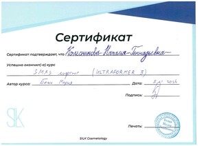 - 2009, Москва, Учебный центр «РЕДНОР», специальность «Врачебная косметология»;