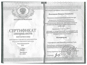 - 2018, Москва, Институт повышения квалификации ФМБА России, специальность «Косметология»;