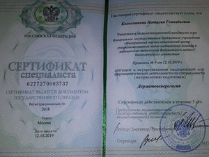 - 2019, Москва, Институт повышения квалификации ФМБА России, специальность «Дерматовенерология».