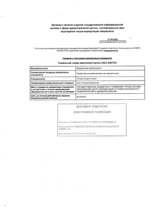 - 2022, Москва, НИКИО им. Л.И. Свержевсого, оториноларингология, специальность «Врач-оториноларинголог».