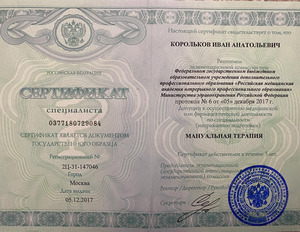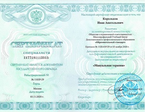 - 2020, Москва, Центр дополнительного профессионального образования «Образовательный стандарт», «Мануальная терапия».
