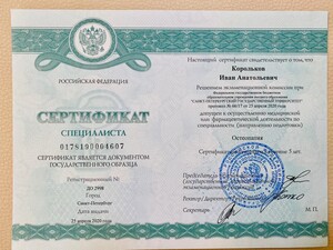 - 2020, Санкт-Петербург, ФГБОУ ВО «Санкт-Петербургский Государственный Университет», «Остеопатия»;