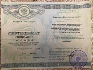 - 2020, Санкт-Петербург, ФГБОУ «Санкт- Петербургский государственный университет», «Остеопатия», действующий сертификат;