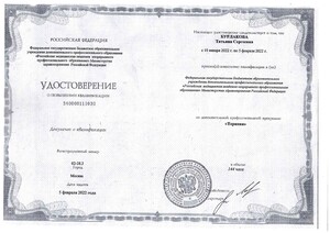 - 2016, Российская Медицинская академия Непрерывного Профессионального Образования (РМАНПО), «Терапия»;