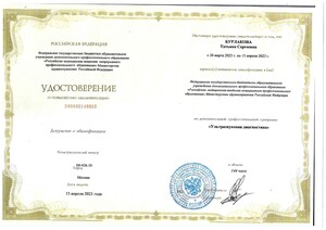 - 2018, Российская Медицинская академия Непрерывного Профессионального Образования (РМАНПО), «Ультразвуковая диагностика»;